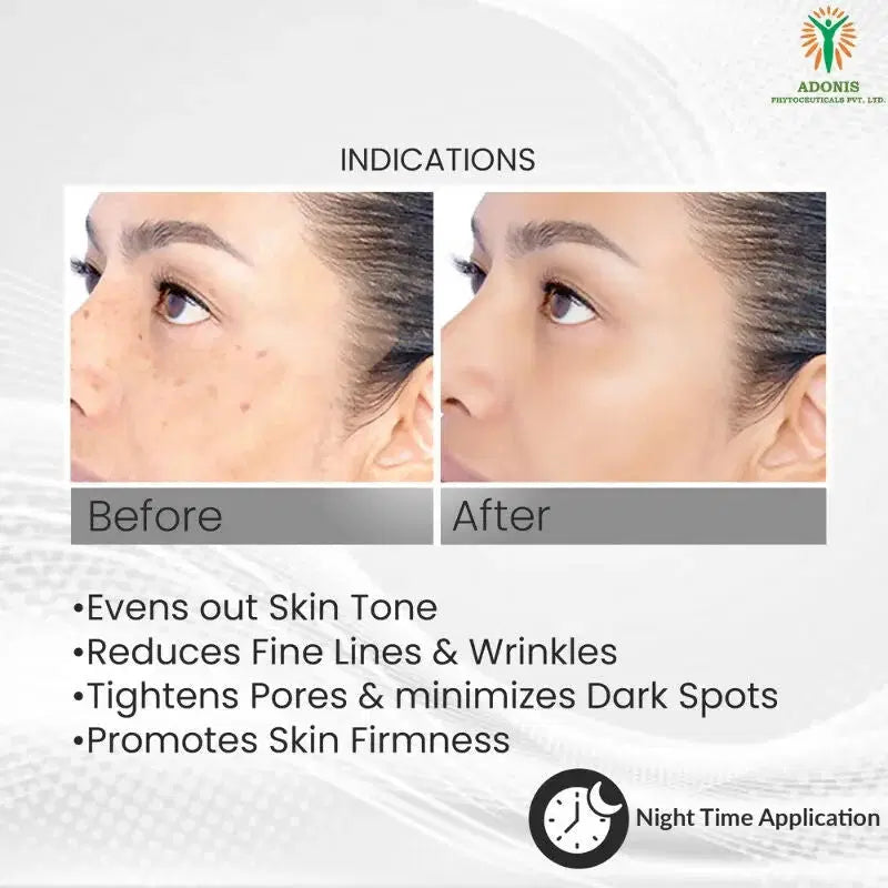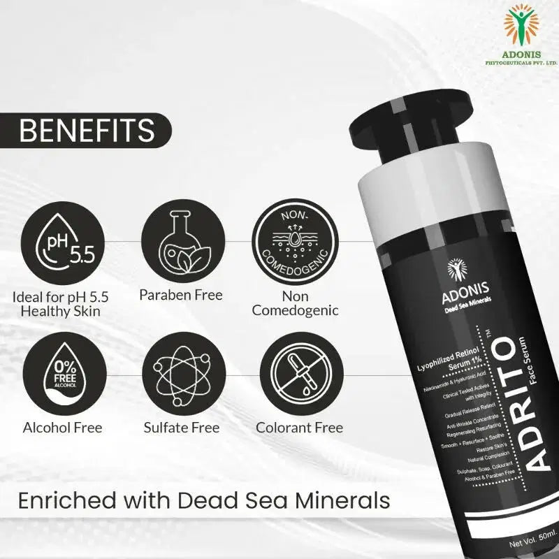 - Adrito Face Serum has Lyophillized Retinol,Hyaluronic Acid,Alpha Arbutin,Niacinamide and Dead sea minerals. Adrito Face Serum is ideal for pH 5.5 healthy skin. Adrito Face Serum is Sulphate,Alcohol,Colourant and Paraben Free. Adrito Face Serum is advised for Night time application only.Retinol in Adrito Face Serum increases collagen production which is proven to promote skin elasticity while reversing aging by decreasing fine lines and wrinkles.Hyaluronic acid in Adrito Face Serum helps to reduce the appearance of fine lines and wrinkles by filling in the spaces between collagen and elastin fibres.Alpha Arbutin in Adrito Face Serum reduces pigmentation and dark spots,improves skin tone and is gentle on skin.Niacinamide in Adrito Face Serum supports production of ceramides which improves skin's barrier,preventing both water loss and the invasion of potential irritants.Dead sea minerals in Adrito Face Serum provides anti-aging benfits by tightening and toning skin,reducing fine lines and wrinkles and shrinking pores.